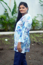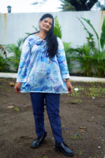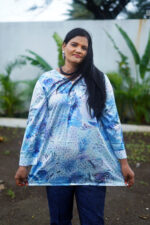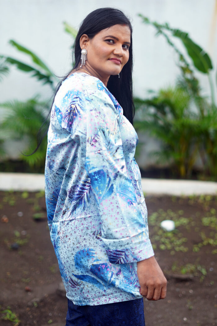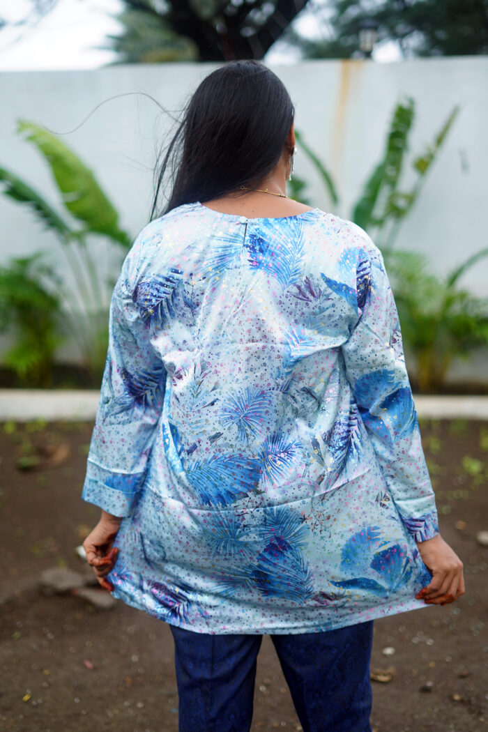 Step into effortless elegance with this Imported Silk Top, designed in a soft sky-blue base with vibrant tropical & starry patterns. The glossy finish of silk enhances the print, making it look rich and eye-catching.