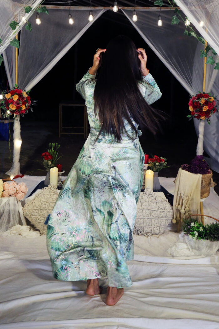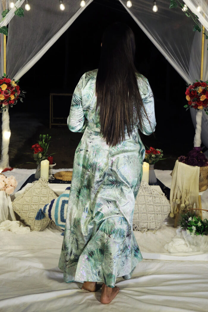 Step into timeless elegance with our Imported Silk Printed Dress, crafted in a soft, lustrous fabric that flows effortlessly with every movement. The glossy silk texture elevates the look, while the pastel green botanical print adds freshness and charm.