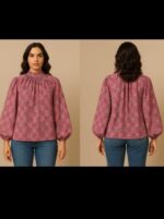A stylish and airy georgette top in a soft pink shade, featuring an elegant printed pattern and playful balloon sleeves. Perfect for casual outings or semi-formal occasions, it combines comfort with a chic, feminine look.
